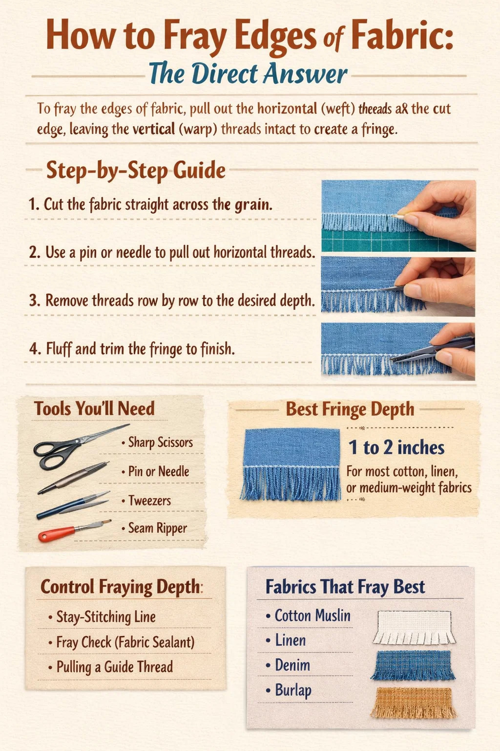 Плотные ткани с большим количеством нитей, например, высококачественный хлопок для квилтинга с 200 ниток на дюйм или более , потребуется больше усилий и терпения, чтобы растереться, но получится более тонкая и изысканная бахрома.